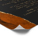 An elegant sign for your wedding bar menu. The words "bar menu" appears in gold-colored handwriting calligraphy with swashes at the beginning and end, with customizable text below. A burnt orange watercolor agate design trimmed with gold faux glitter decorates the left border on a slate black background. See our collection for matching wedding invitation suite and day-of stationery.