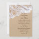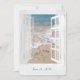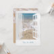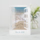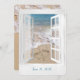 Open window with curtains overlooking newlyweds' names in beach hearts and sand with frothy ocean surf for wedding invite.