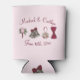 Can cooler design features an original illustration of a wedding boutonniere, bells, bouquet and bow tie on a pink background.