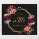 A chic black background with a faux gold geometric frame. Decorated with dark purple and burgundy flowers, roses and boho style feathers. Personalise and add your monogram, initials and your wedding date. Your family name's initial in the middle with a capital letter. Golden coloured letters.