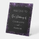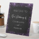 A black background, decorated with purple faux glitter sparkles. With the text: Welcome to The Wedding of. Personalise and add your names.