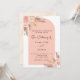 For a modern boho style wedding. An arch frame, white and rose gold coloured background. Decorated with rose gold and pink florals, roses and pampas grass. Personalise and add names and details.