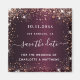 A burgundy background color. Decorated with rose gold faux glitter dust. Personalize and add a date, place and your names. Save the Date is written with a modern hand lettered style script with swashes.
