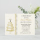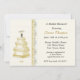 A bridal shower invitation with pretty gold wedding cake with bride and groom topper with umbrella on buff background. Side border of daisies and bows.