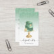 This elegant bakery business card features a mint green and gold wedding cake illustration on a green ombre background, with a top border of green dripping faux glitter. Customize it with your business name in black handwriting script with swashes at the beginning and end, and your contact information in black sans serif font. (To keep the swashes, replace only the letters in those text fields, leaving the symbols in place.)