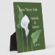 A graphic illustration of a calla lily flower by artist/designer Charmaine Paulson on a "Love never fails" custom wedding plaque.