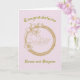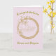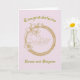 Wedding card with names of bride and groom written on the front, (the names and most of the words on the card can be changed). The exception is the word "Wedding" in the centre of the wreath. The writing on the inside has a religious tone, and the card is a light pink and a gold colour.