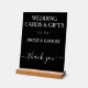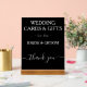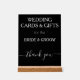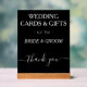 Wedding cards and gifts for the bride and groom is written in white typography against black background. Formal wedding reception table display. Thank you is written in script. Designs by TamiraZDesigns.