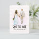 A simple, modern save the date design. Front side has the illustration of a bride and groom walking hand in hand along with "save the date" announcement. Back side of the design follows the colour theme of pink, browns and white. It has the bride and groom's name in big bold letters on the top. And on the bottom, the date and the location details follow.