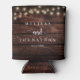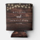 Wedding Dinner and Party, Rustic String Lights, cottage dark wood background Can Cooler