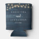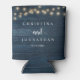 Wedding Dinner and Party, Rustic String Lights, dark navy blue wood background Can Cooler