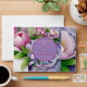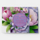 Beautiful & Elegant, Boquete of Pink & Violet Peonies with Satin Violet Bow at Bottom, surrounding A (Violet) Circle Horizon, topped with "Our Wedding" & "Date", on Layered (Two Shades at Top) Violet background.