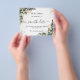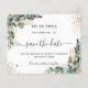 A trendy wedding Save the Date. A stylish white background decorated with eucalyptus foliage, golden foliage and faux gold glitter dust. Personalise and add a date, names and text. The text: Save the Date is written with a large trendy hand lettered style script with swashes.