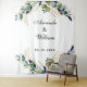 For an elegant wedding. Chic white background. Decorated with green watercolored eucalyptus leaves, sprigs, greenery and a faux gold leaves. Personalise and add the names of the bride and groom, and the date. Black and golden letters. Can be used as a welcome banner, as party wall decoration or as a photo booth backdrop.