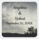 This beautiful wedding sticker features a photo that captures an evening landscape with the sun's rays breaking through the grey and white clouds. The land appears in black silhouette along with the branches of a distant tree. The sunlight creates diagonal lines across the two-tone sky. The bride and groom's name and wedding date appear in black script and can quickly be personalised.