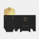 An elegant black and gold wedding favor box. The flap is faux gold foil and it has a black crest with the wedding monogram in it, from the two initials of the bride and groom.
