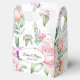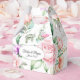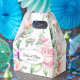 This wedding favour box is shown in a lovely multi colour floral print design. Shown with sample names and date.