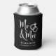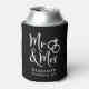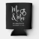 Give a wedding toast and your wedding guests a fun souvenir keepsake of your special day with this custom black can cooler with "Mr & Mrs" written in a large white script and an illustration of two wedding rings joined together. Add your name and wedding date below.
