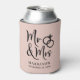 Give a wedding toast and your wedding guests a fun souvenir keepsake of your special day with this custom blush pink can cooler with "Mr & Mrs" written in a large script and an illustration of two wedding rings joined together. Add your name and wedding date.