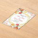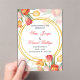 "Vibrant wedding invitation adorned with colorful tulips in shades of red, orange, yellow, and pink, beautifully framing the text within elegant golden circles. The combination of floral artistry and refined typography creates a joyful and romantic design, perfect for celebrating love in style."