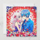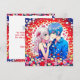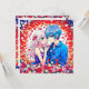 Personalised thank you notes for your anime themed wedding. Red, blue and white flowers and a cute anime couple cuddling.