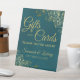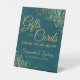 This pretty tabletop sign is designed to make it easy for your wedding guests to know where to leave their gifts and cards. It features a simple yet elegant dark teal and gold design with script lettering and lacy golden faux foil frills in the corners. The sign reads: Gifts and Cards Thank you so much! There is room for your names and the wedding date below.