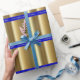 This photo gloss wrapping paper has a golden background with blue stripes and the expression: “Congratulations on your Wedding.” This wrapping paper is a unique elegant item for your wedding gifts as well as a great present in itself to someone special.