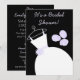 Pretty bridal shower invitation featuring a stylised wedding gown and flowers in shades of purple and white on a black background, and white and purple text. A customisable design for you to personalise with your own text, pictures and ideas.