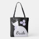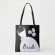 Pretty bridal themed canvas bag in shades of purple featuring a stylised wedding gown and flowers on a black background. A customisable design for you to personalise with your own text, pictures and ideas. Artwork created by Jess Perry.