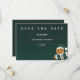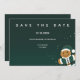 A wedding Save the Date card with a seasonal, Christmas, gingerbread man Santa illustration. The colour scheme is green and white and the design has a mix of whimsy and modern.