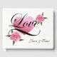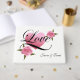 This guest book is shown in white with a pretty pink roses and Love print with custom sample names.