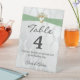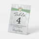 Sage green ribbon in a gold heart with baby's breath bouquet on satin damask design for table number tent.