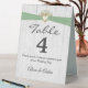 Sage green ribbon in a gold heart with baby's breath bouquet on rustic whitewashed wood for table number tent.