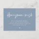 Celebrate the beginning of your journey together with our elegantly crafted "honeymoon wish" wedding invitation dusty blue theme enclosed card. Featuring a sophisticated blend of modern script and romantic allure, each card is meticulously designed to convey the essence of your special day. Perfectly suited for couples seeking a unique way to share their honeymoon dreams, this card invites your loved ones to contribute towards unforgettable experiences. Whether nestled in a luxurious envelope or presented alongside your wedding invitations, our card adds a touch of enchantment to your celebration, promising cherished memories that last a lifetime. Designed by TeeshaDerrick.