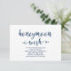Celebrate the beginning of your journey together with our elegantly crafted "honeymoon wish" wedding invitation Navy blue theme enclosed card. Featuring a sophisticated blend of modern script and romantic allure, each card is meticulously designed to convey the essence of your special day. Perfectly suited for couples seeking a unique way to share their honeymoon dreams, this card invites your loved ones to contribute towards unforgettable experiences. Whether nestled in a luxurious envelope or presented alongside your wedding invitations, our card adds a touch of enchantment to your celebration, promising cherished memories that last a lifetime. Designed by TeeshaDerrick.