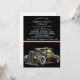 This unique design combines a formal wedding invitation with a vibrant hot rod illustration. The upper section features details for his name and her name wedding celebration on "Saturday, January 18, 20XX" in Vancouver, BC. Below, a powerful, brightly coloured hot rod with exposed engine and exhaust pipes speeds forward, creating a striking contrast of themes. all customisable.
