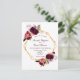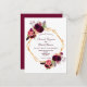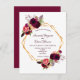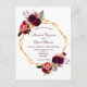 On front: A modern and trendy wedding invitation. A white background with a faux gold geometric frame. Decorated with dark burgundy and pink flowers, roses and boho style feathers. Templates for Your names and wedding details. The names are written with a hand lettered style script, bugundy coloured letters.