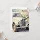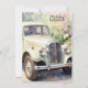 A wedding invitation featuring an elegant wedding car within a graceful floral setting