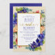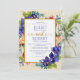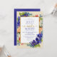 Watercolor floral arrangement of deep blue/purple flowers complimented with red flowers with a glittery gold frame. Complimentary gold script "and" with hearts to accent your union. Deep purple backside. All type is customisable.