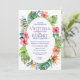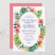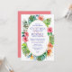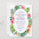 Watercolor floral arrangement of tropical leaves and flowers in a surrounding an oval frame. Complimentary pink background on the back (or whatever colour you desire). All type is customisable (including the colours).