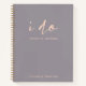 A stylish wedding journal with handwritten script typography "I do" paired with modern typography title and bride and groom names in blush pink on a soft lilac grey background.