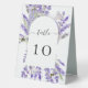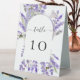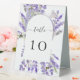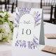 A stylish white backgrond decorated with an arch frame of violet, lavender florals. Personalise and your table numbers. Black letters.