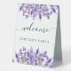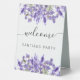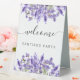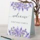 A welcome sign for a party. A white background, decorated with watercolored lavender florals, flowers. Personalise and add your name. Black letters.