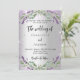 A modern, stylish wedding invitation. A faux silver looking background with violet faux glitter, sparkles, lavender florals, flowers and eucalyptus greenery. Personalise and add your names and the details.