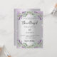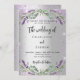 A modern, stylish wedding invitation. A faux silver looking background with violet faux glitter, sparkles, lavender florals, flowers and eucalyptus greenery. Personalise and add your names and the details.