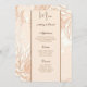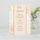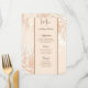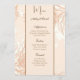 This wedding menu card is shown on basic paper in a lovely floral print. Script and standard text in a brown tone colours.