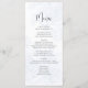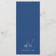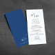 This design features a wedding menu card, with an elegant calligraphy script, with classic blue floral design, with a simple meal course, and ampersand monogram on the back.