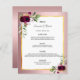 An elegant bohemian boho style wedding menu card. Feathers and lush watercolored roses in burgundy. Templates for your names, date and the wedding menu. A faux gold and white frame and a chic dusty rose background colour. Grey coloured letters.