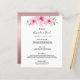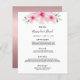 An elegant tropical wedding menu card. Pink flowers, florals hibiscus as decor. On front: white background. Templates for your names, date and the wedding menu. Black coloured letters. Back: Rose gold, dusty rose faux metallic looking background.