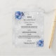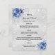 An elegant, glamourous wedding menu. Personalise and add your names, date and the wedding menu. Faux silver looking background, decorated with faux glitter dust and blue flowers.